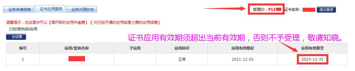 溫馨提醒:證書應用有效期內方可受理,也就是指證書應用有效期須超出當前日期,否則不予受理。